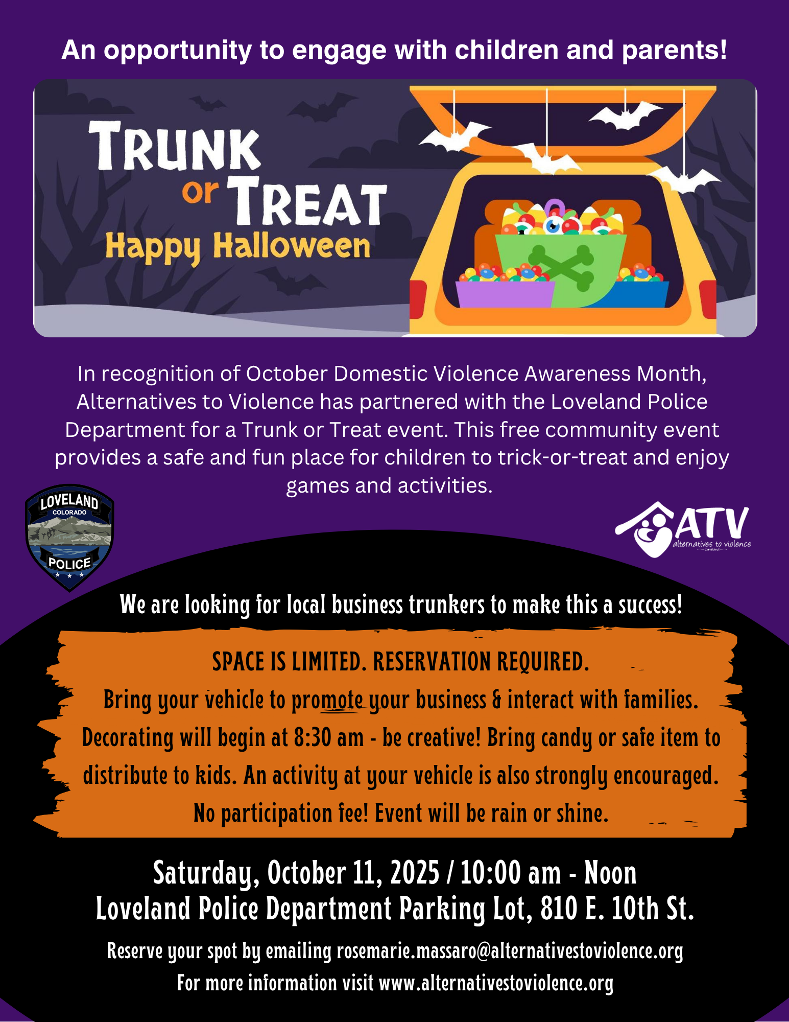 This event is done in recognition of October Domestic Violence Awareness Month with the Loveland Police Department. This free community event provides a safe and fun place for children to trick-or-treat and enjoy activities. Kids come in costume and bring a bag to trick or treat from local "trunkers".
